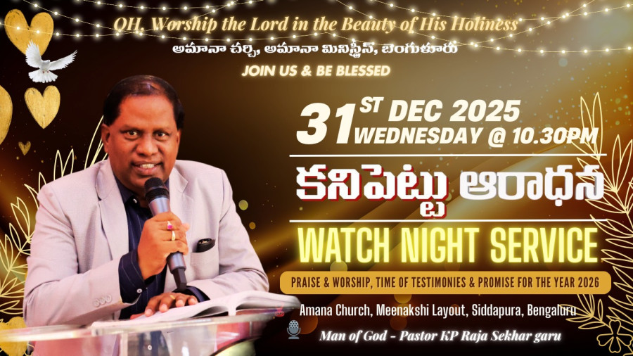 31st Dec 2025 Watch Night Service @10:30 PM Click 31st Dec 2025 Watch Night Service @10:30 PM New 31st Dec 2025 Watch Night Service @10:30 PM New https://www.youtube.com/watch? Sunday Worship At 10:00 am New Sunday Worship At 10:00 am New worship the LORD in the beauty of holiness! Sunday School At 10:00 AM New Sunday School At 10:00 AM New Let the little children come to ME, and do not forbid them; for of such is the kingdom of heaven. Youth Meeting Sunday 2:00 PM New Youth Meeting Sunday 2:00 PM New Let no one despise your youth, but be an example to the believers in word, in conduct, in love, in spirit, in faith, in purity. Bible Study Tuesday 8:00 PM New Bible Study Tuesday 8:00 PM New Teaching them to observe all things that I have commanded you; and lo, I am with you always, even to the end of the age. Fasting Prayer Friday 8:00 PM New Fasting Prayer Friday 8:00 PM New Now it came to pass in those days that He went out to the mountain to pray, and continued all night in prayer to God. Join us for All Night Prayer Join us for All Night Prayer Join us for Sunday school online Join us for Youth Meeting & Womens' Fellowship Join us for Sunday school online Join us for Youth Meeting & Womens' Fellowship Join us for Youth Meeting & Womens' Fellowship Join us for Sunday school online Join us for Sunday school online Join us for Sunday school online